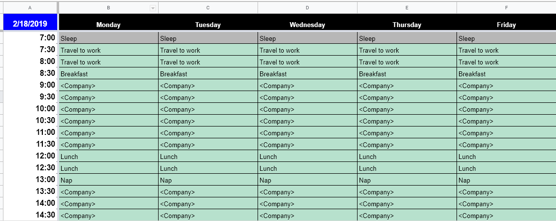 Để áp dụng kỹ thuật này, bạn cần tạo sẵn một file excel hoặc spreadsheet với các khung giờ cố định trong tuần như hình bên dưới.